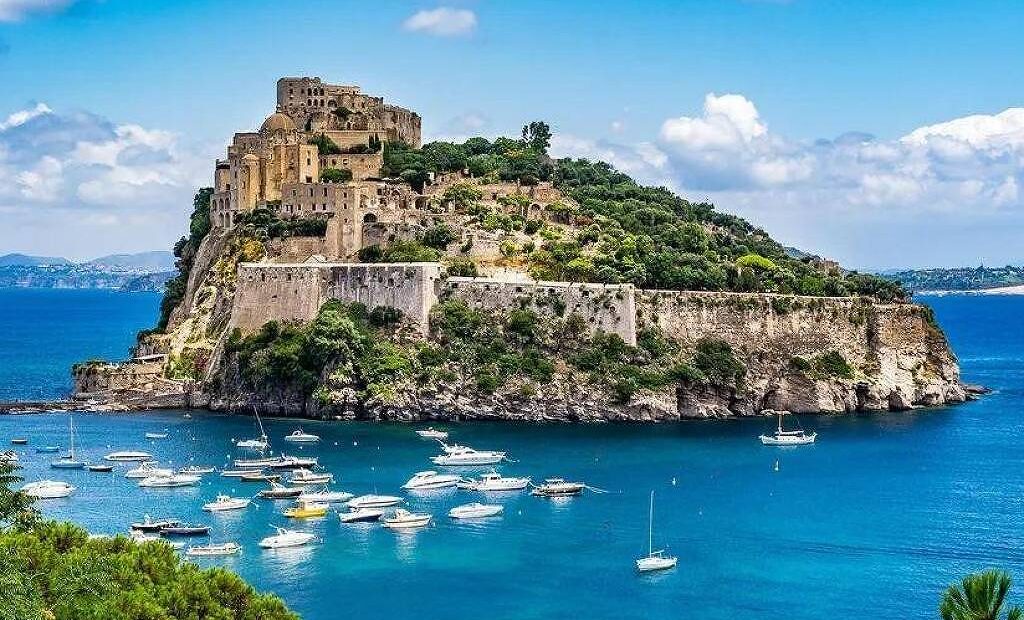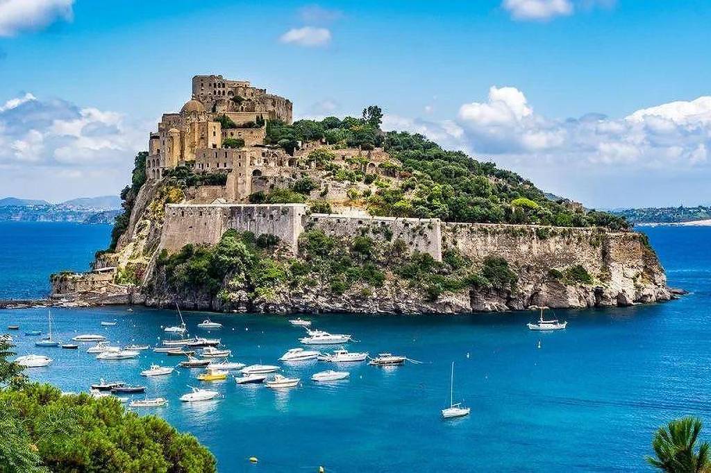 Penhascos emergem das ondas; turistas e moradores locais tomam sol na ponte que leva ao Castelo Aragonês, um forte medieval de 2.500 anos construído sobre uma ilhota que se une à ilha como a cauda de uma baleia.