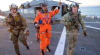 Ao chegarem, eles são examinados imediatamente por médicos a bordo do navio americano enviado para resgatá‑los. Em seguida, são levados de helicóptero até a costa e depois transportados de avião para o Centro Espacial Johnson da Nasa, em Houston.