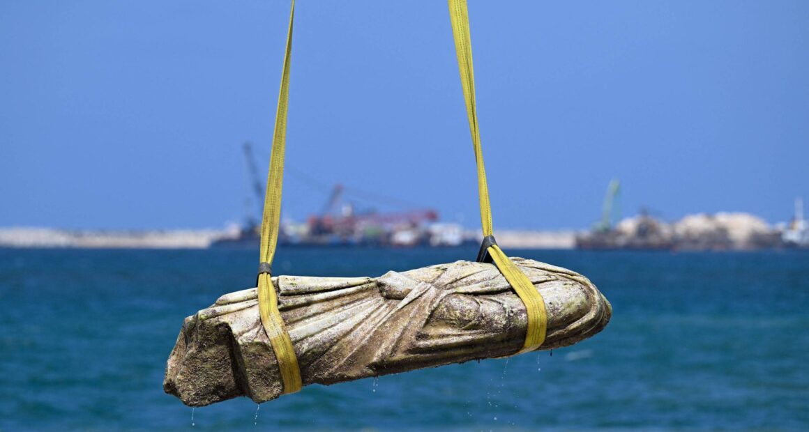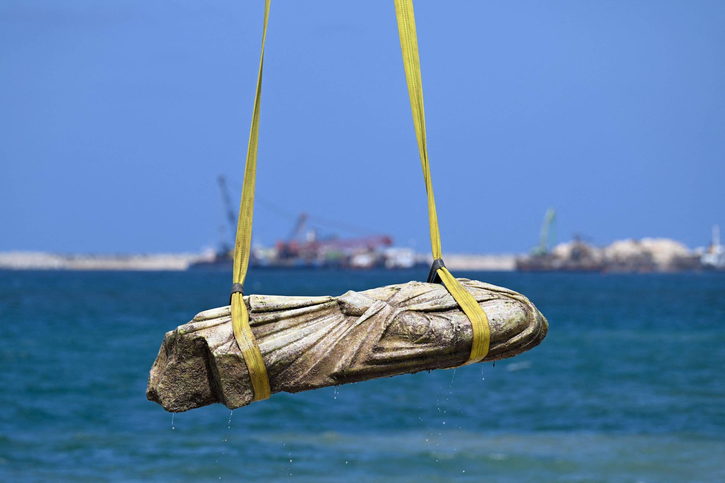 Nesta quinta-feira, guindastes retiraram várias estátuas. “Há muitos elementos embaixo d’água, mas o que podemos recuperar é limitado; são apenas peças selecionadas de acordo com critérios rigorosos”, declarou o ministro de Turismo e Antiguidades, Sherif Fathi.