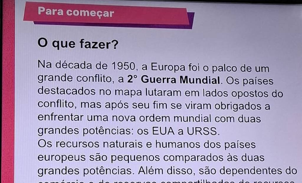 “Na década de 1950, a Europa foi o palco de um grande conflito, a 2° Guerra Mundial”, diz o trecho incorreto do material intitulado como “Globalização e economia mundial”.