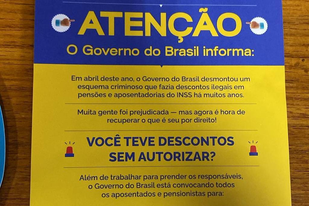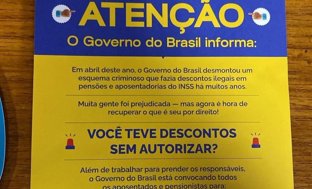 O material traz com letras maiúsculas a palavra “atenção” e a seguinte frase: “Em abril deste ano, o Governo do Brasil desmontou um esquema criminoso que fazia descontos ilegais em pensões e aposentadorias do INSS há muitos anos”.