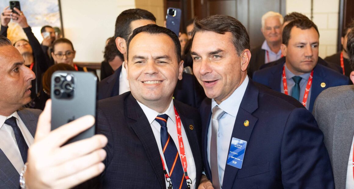 Flávio e Eduardo participam juntos de uma palestra durante o Cpac neste sábado (28). Esta é a terceira viagem do pré-candidato à presidência aos Estados Unidos neste ano. Depois da agenda em Dallas, ele segue nos próximos dias em solo americano para uma agenda que não foi divulgada.